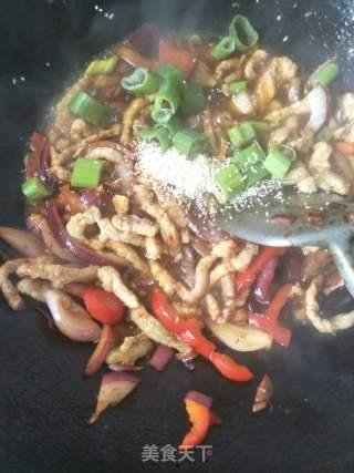5. 加入青红椒:将切好的青红椒丝放入锅中,快速翻炒。